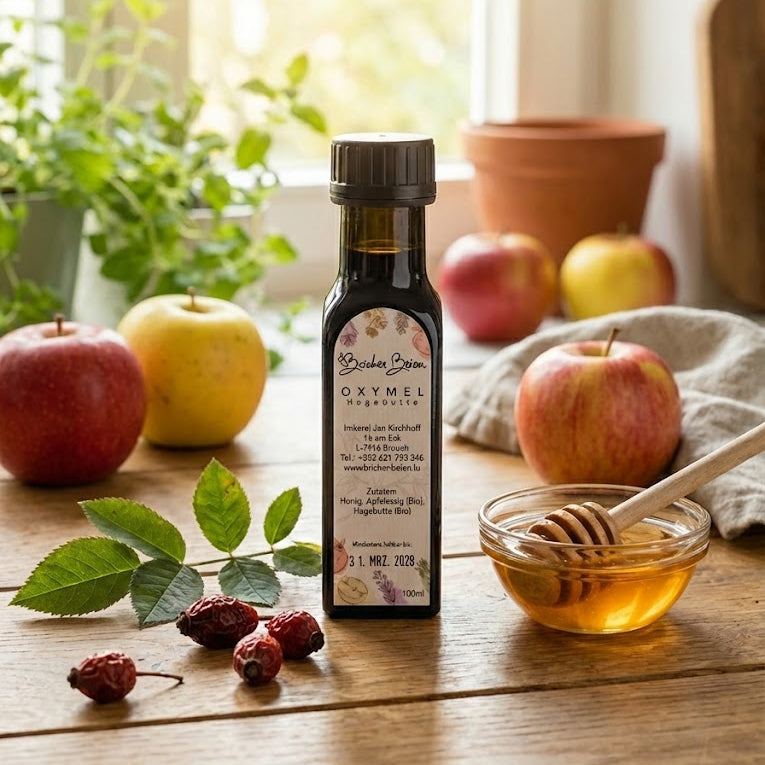 Fruuchteg-säerzeg Oxymel aus Hunneg, Apfelesseg an handgepflückten Hagebutten (100 ml) - en natierlecht Tonicum fir deeglech Genoss an eng Villfalt u Goûten.