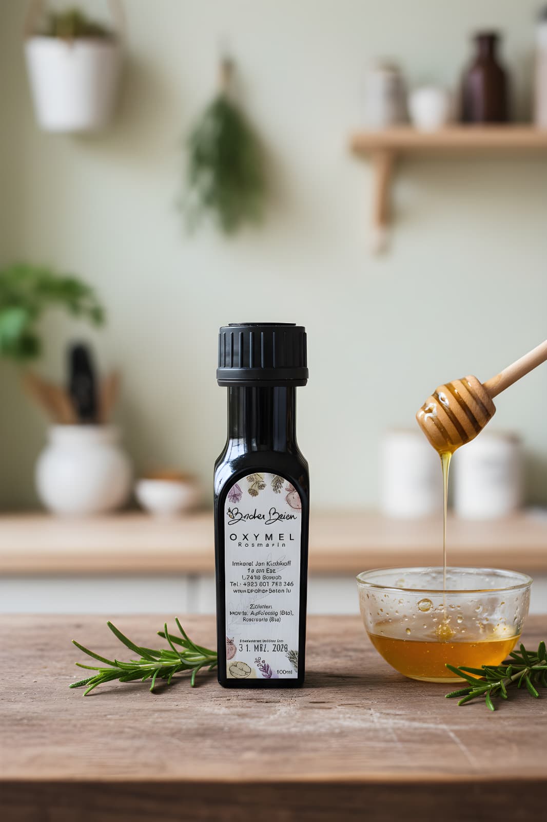 Unser Oxymel, hergestellt aus Imkerhonig und Bio-Apfelessig, angesetzt mit Rosmarin.